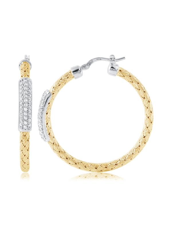 925 SS 35x3MM WOVEN CZ BAR HOOP EARRINGS 18K YG AND RHODIUM FINISH