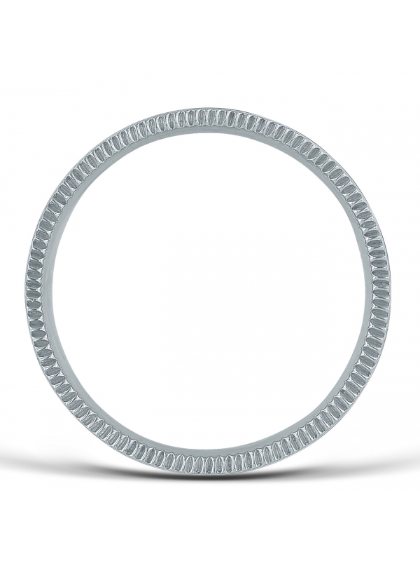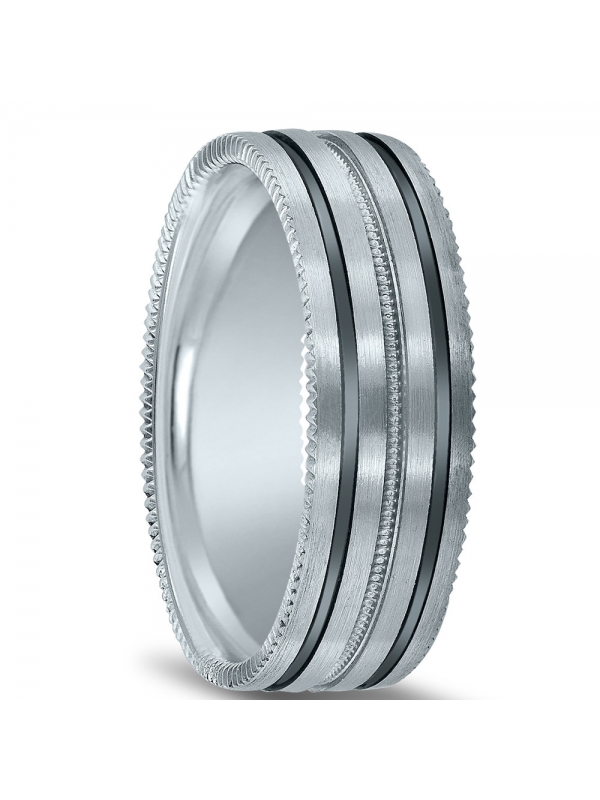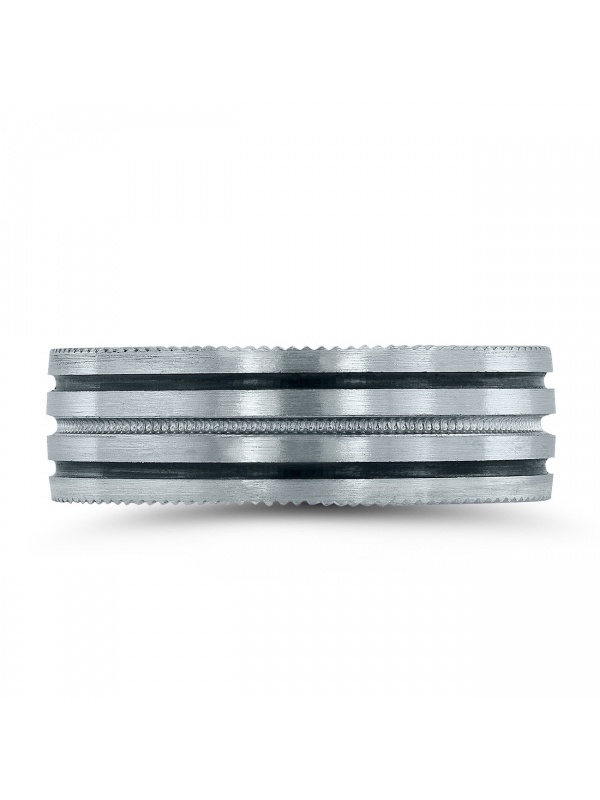 Mens 7mm wide wedding band with black rhodium grooves and center milgrain.