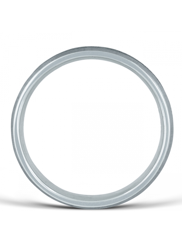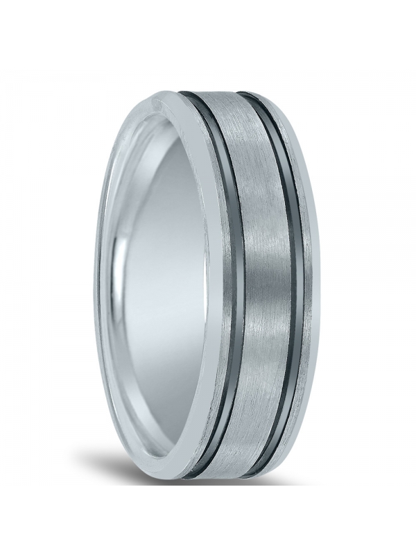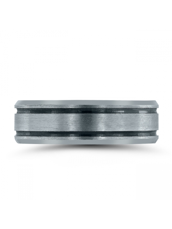 Mens 7mm wide wedding band with black rhodium grooves and bright beveled edges.