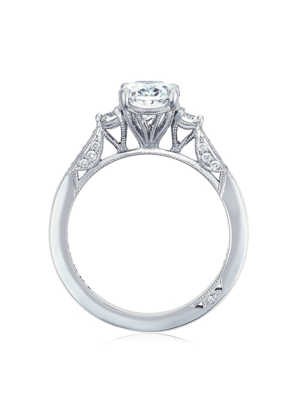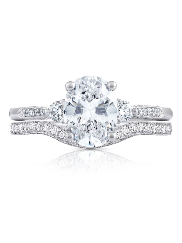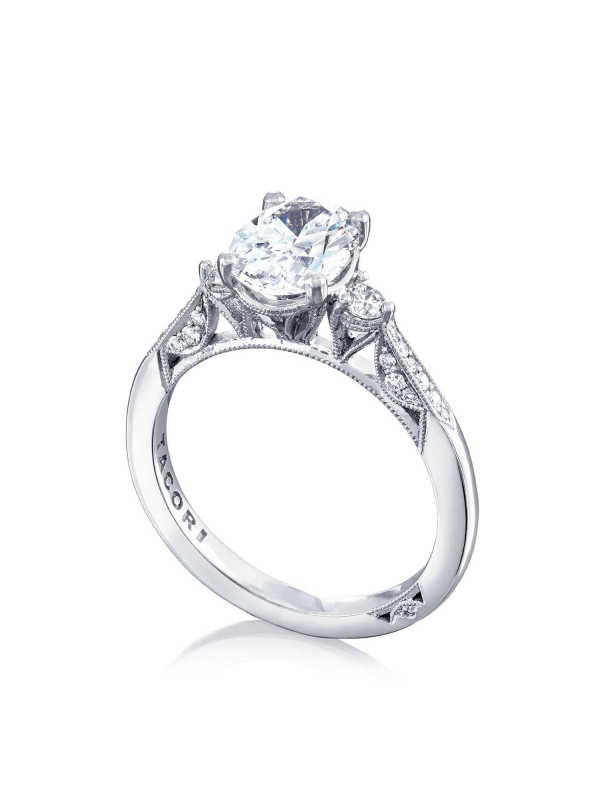 Simply stunning, simply Tacori. Your oval center is brought to life by two high-intensity round side stones and diamond Pav™ detailing on the band.