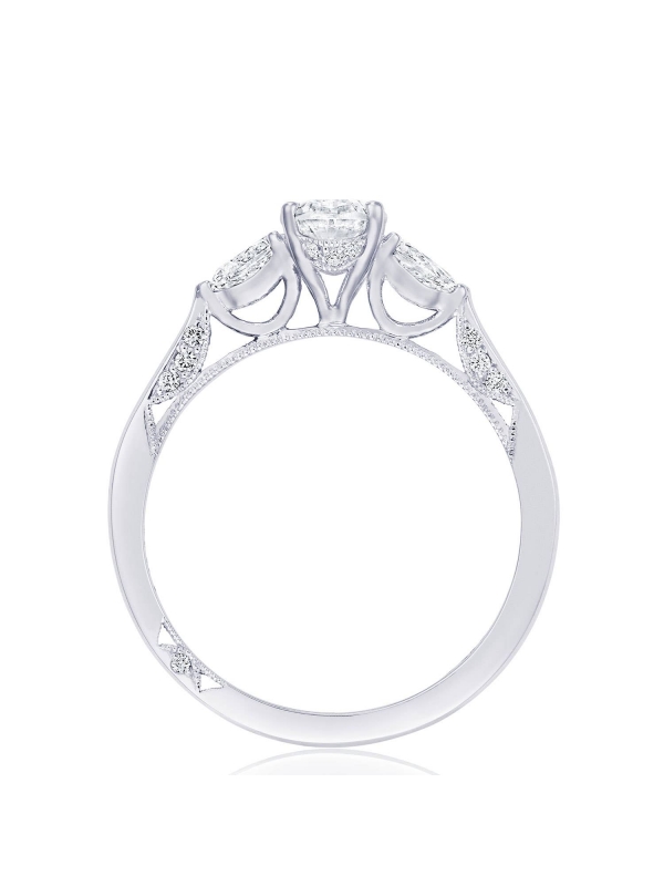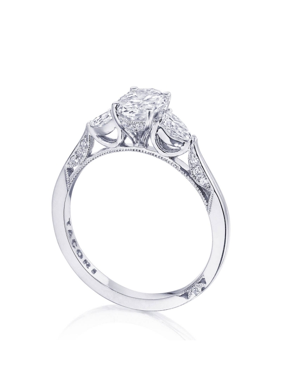 Let your diamond engagement ring stand out by contrasting your side stones with your center diamond Pear-shaped side stones graduate to the oval center, bringing a magical contrast to bring about beauty from every angle.