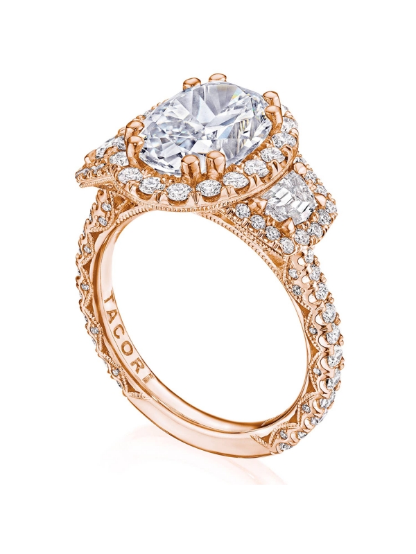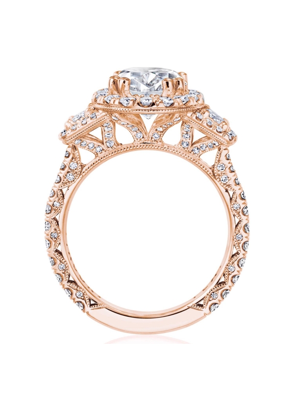 Two cadillac-cut side diamonds embrace the center stone, while a bloom encircles all crowning diamonds. Just below, diamond-studded prongs meet a Petite Crescent fabric and a ceiling of small Pav™-set diamonds.