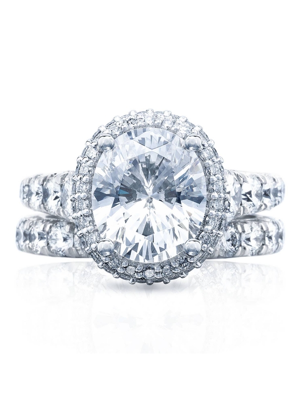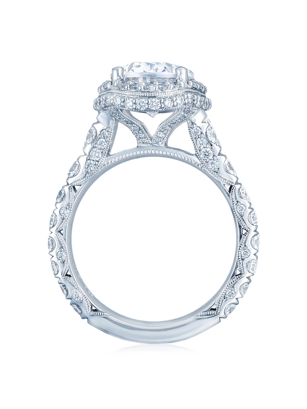 Graduating diamonds lead up the ceiling to an oval-bloomed center stone. An open gallery beneath the crown highlights the diamond, while Petite Crescent fabric adds intricate diamond and milgrain detailing.