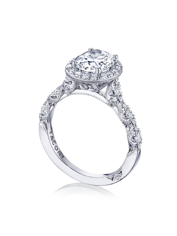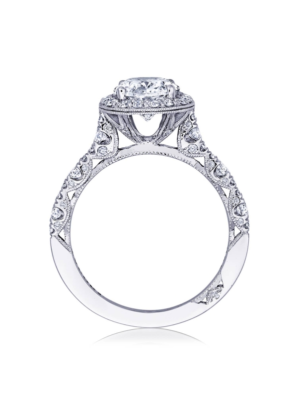 Graduating French Pav™-set diamonds form marquise shapes on the ring ceiling, while diamond-studded Petite Crescent fabric decorates the innerface. The solitaire is set on an intricate Cathedral foundation, embellished with milgrain detailing.