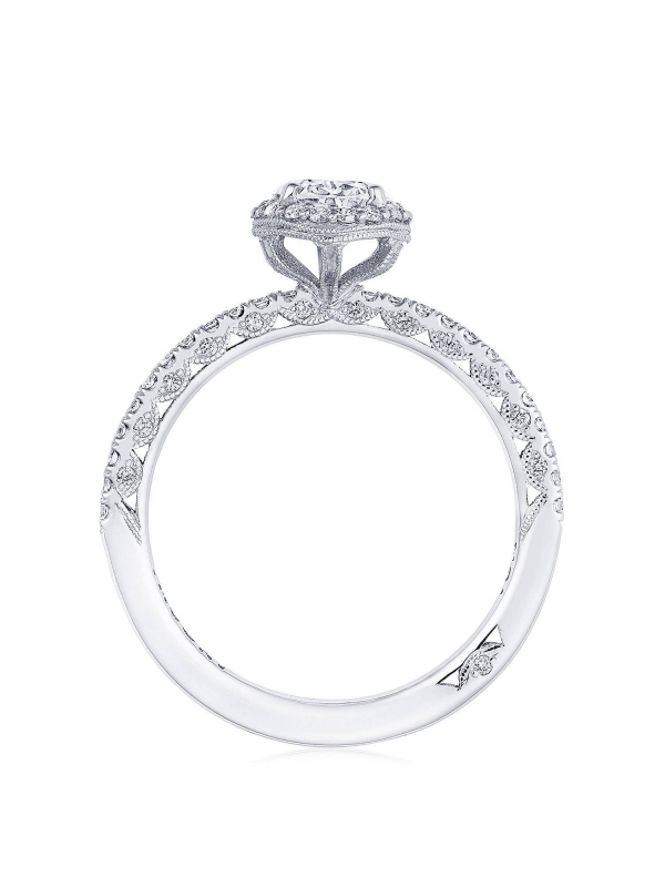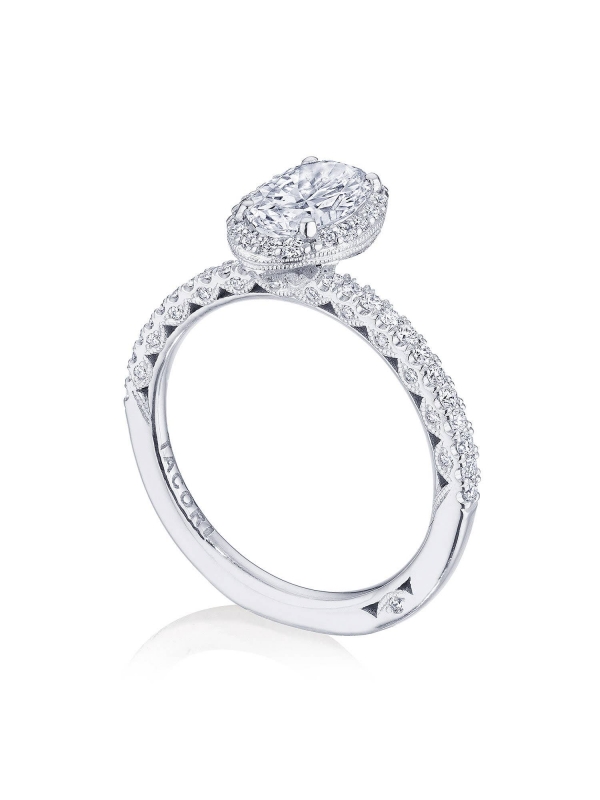Pave-set diamonds decorate the ceiling, while an oval bloom adds dimension to the center stone. The crown floats on a Classic 360 foundation above a band of Petite Crescent with more diamond details. A Signature Crescent marks the resting point.