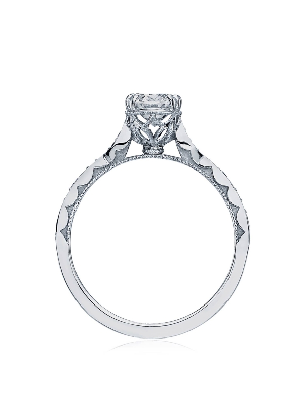Oh-val delight The oval shaped center diamond is complemented with brilliant round diamonds scattered within unique marquise shaped designs. With crisp double prongs securing the oval shaped diamond, this one-of-a-kind engagement ring will sparkle anyway you look at it. Let this heirloom inspired ring be a stunning testament to your endless love.