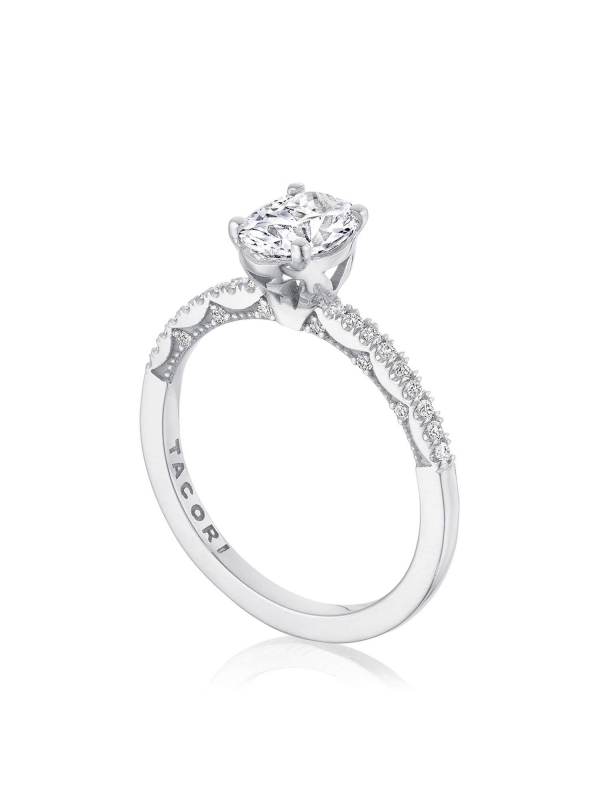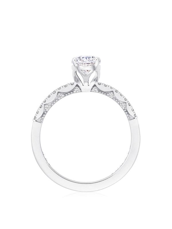 Delicate round-brilliant diamonds are meticulously hand-set into the band, which boasts Coastal Crescent fabric with pinpoint-diamond detailing on the innerface. The center stone appears to float on the Classic 360 foundation.