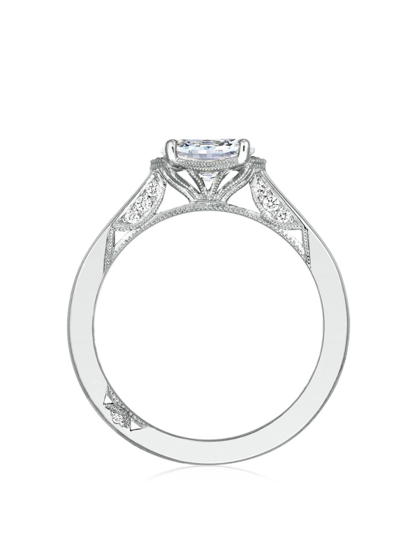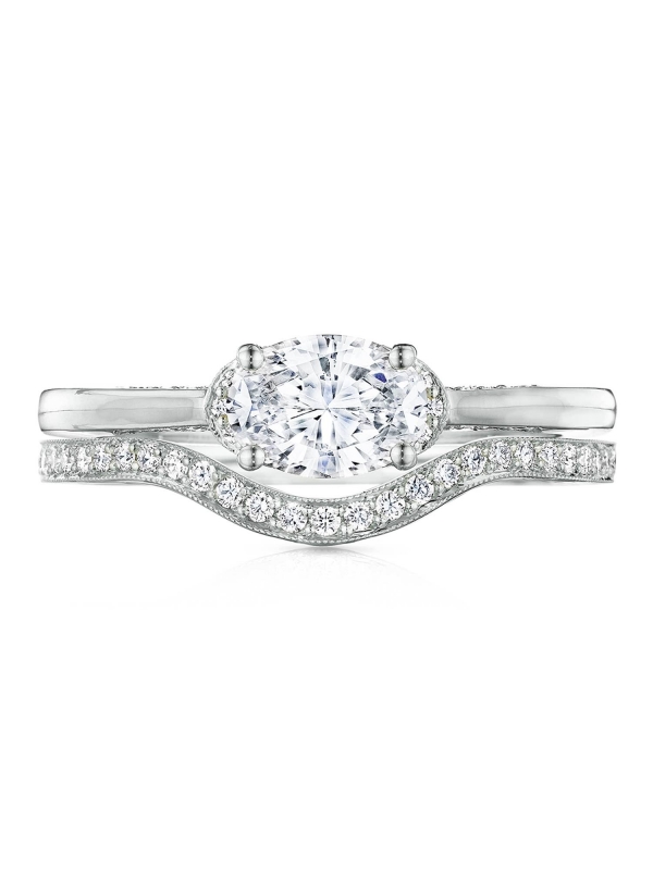 Broaden your horizons Modern and unexpected, your oval center is flipped in a horizontal orientation along the axis of your Tacori ring. Accentuated by a diamond tipped frame that spotlights the elongated elegance of your oval center, this new Tacori style can be worn as a contemporary engagement ring or worn as a fashionable stacking right hand ring.