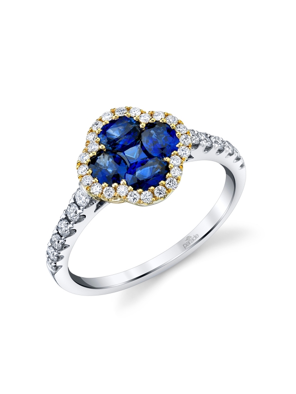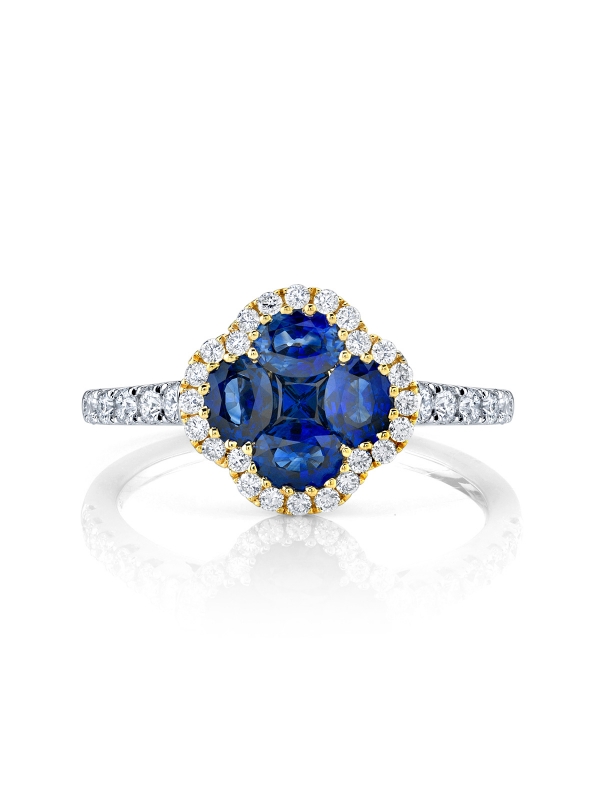 Your lucky blue clover. Deep blue sapphires are expertly set into a quatrefoil design and accented with a diamond halo and shank.