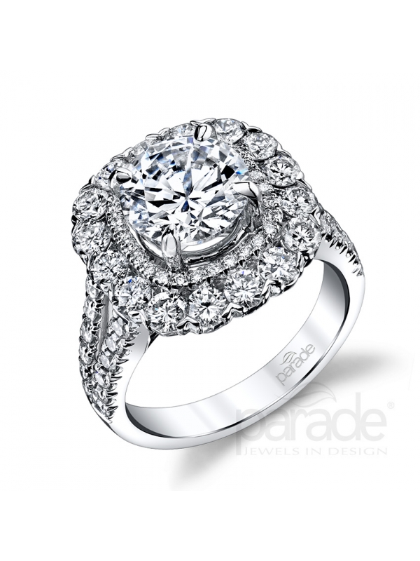 The classic halo is reinvented in this bold new style from the Hemera Collection. A diamond encrusted split band leads to a double cushion shaped halo circling a dazzling round diamond.