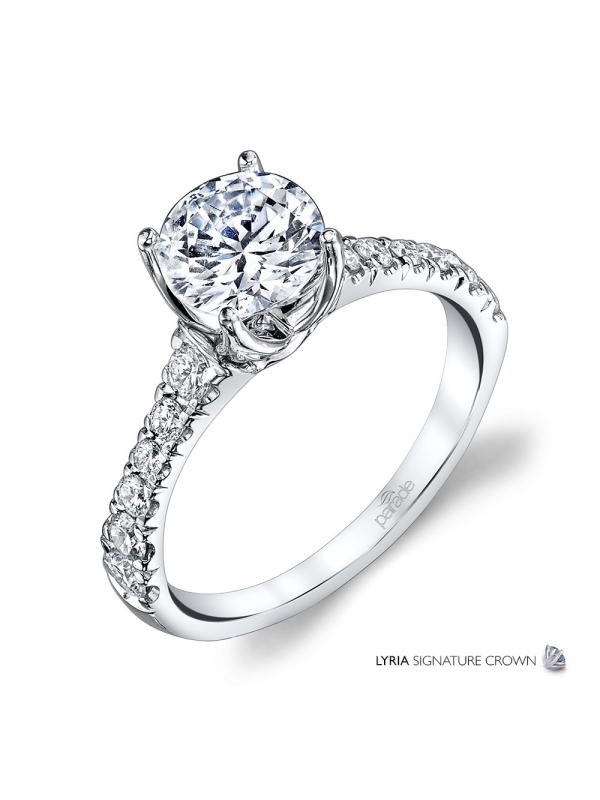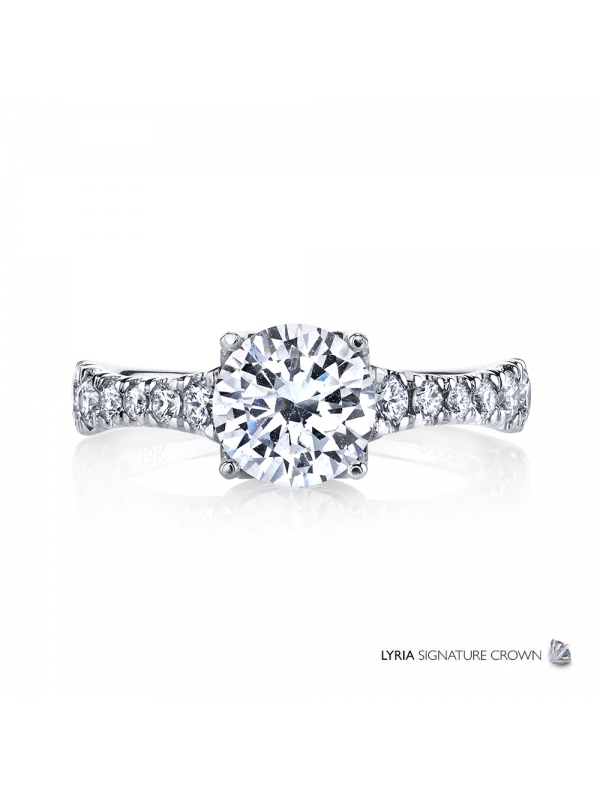 Refined Femininity, A brilliant center stone set in the LYRIA Signature crown sits atop a sculpted band of graduated diamonds set in gleaming high polished gold.