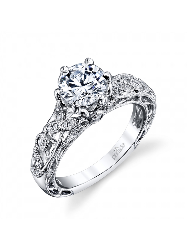 Elegant leaves and vines of milgrained 18K gold and diamonds climb towards a 6 prong crown holding a brilliant round center. Open and intricate filigree work float in the profile completing this vintage inspired stunner from the Lyria Bridal Collection.