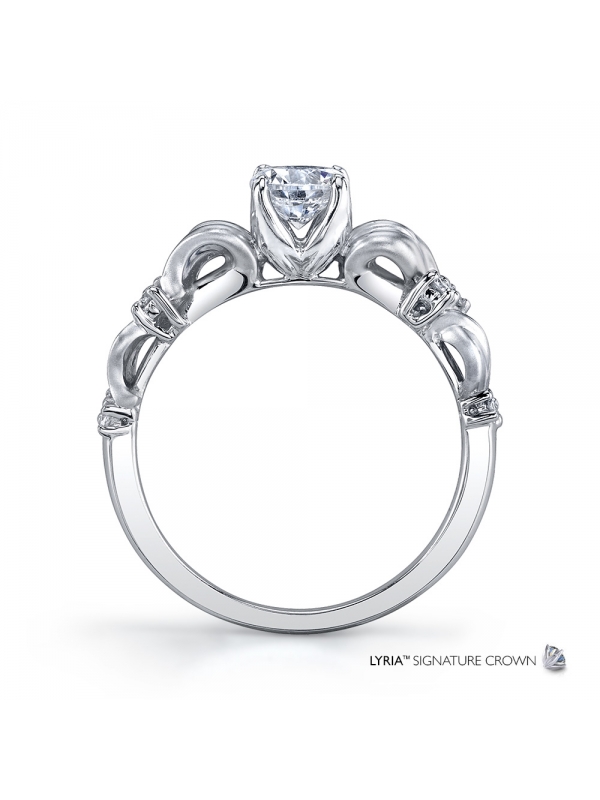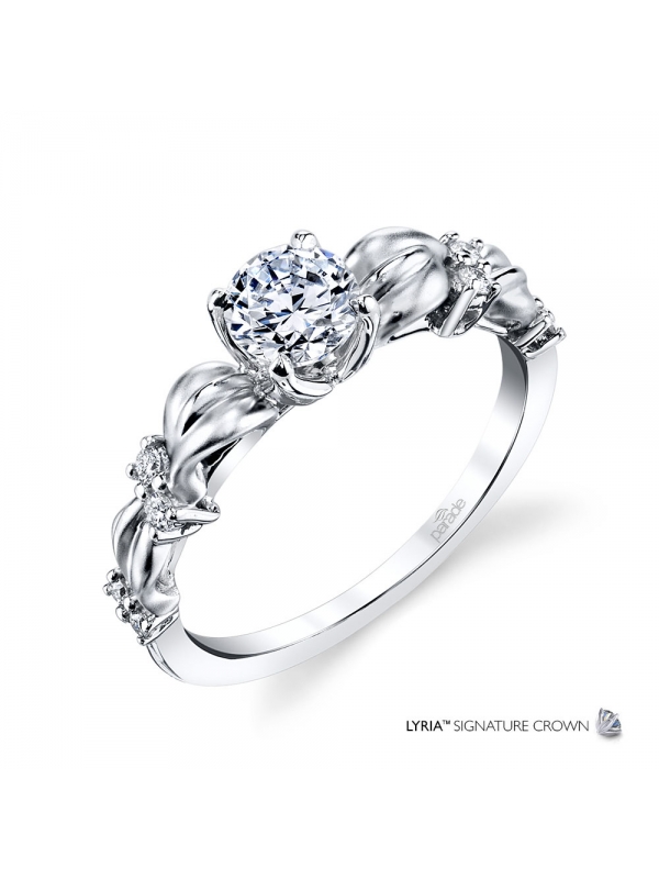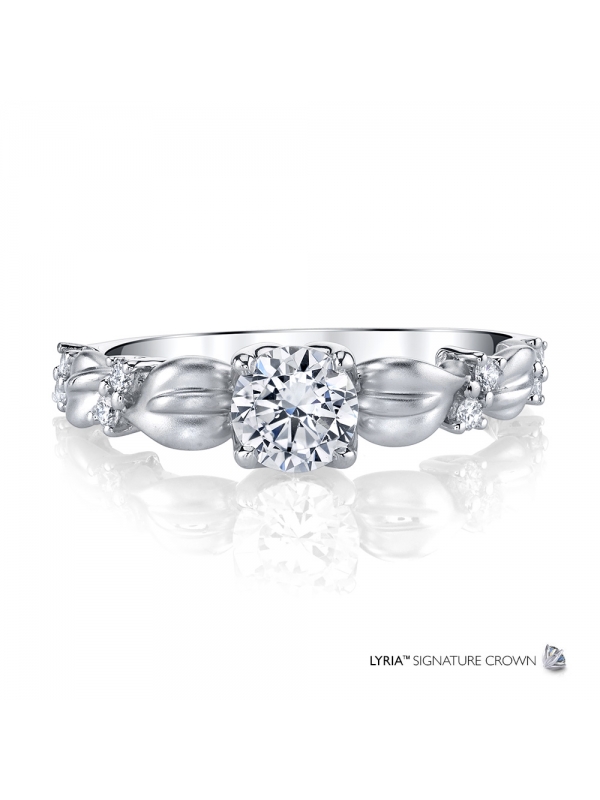 Sparkling white diamonds scattered along satin finished Lyria Leaves of 18K gold climb towards a brilliant center stone set in the Signature Lyria Crown.