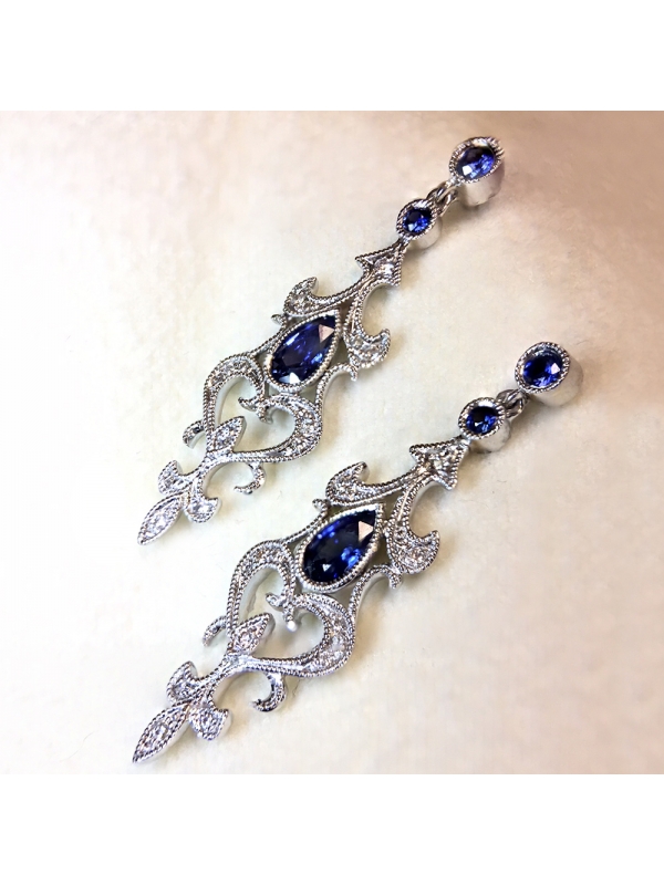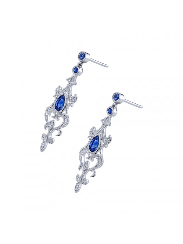 Fine migrain detailing along scrolls of 18K gold set with sparkling white diamonds and blue sapphires complete this vintage inspired design from the Parade in Color Collection.