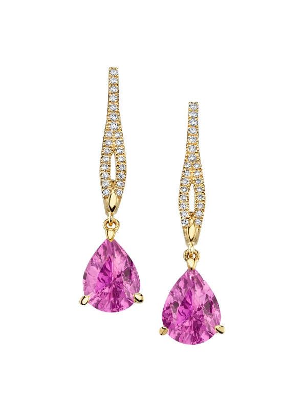 From the Parade in Color Collection, pear drops of bright pink sapphires dangle from split diamond set posts of gleaming 18K yellow gold.