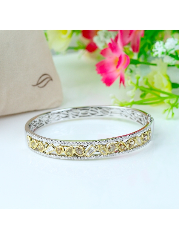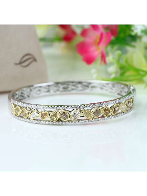 A playful mixture of fancy diamonds totaling 4.04 carats boasts a spectrum of colors including rich golden tones, deep amber and flashes of champagne, accented by sparkling white diamonds in this classic bangle.