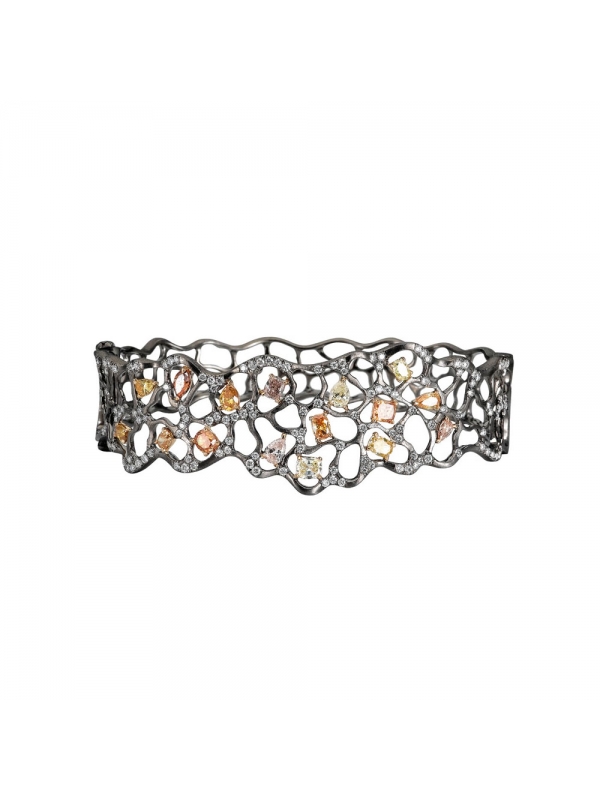 Natural fancy color diamonds pop from a free-form web of matte finished 18K black gold in this stylish and sleek bracelet from The Reverie Noir Collection.