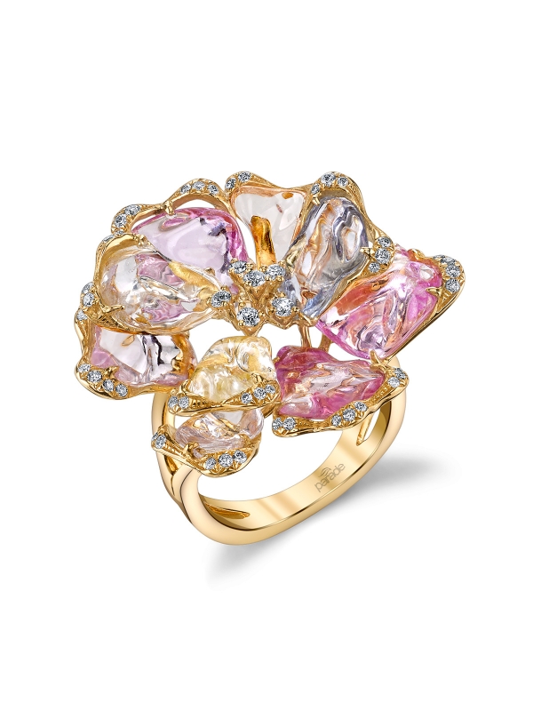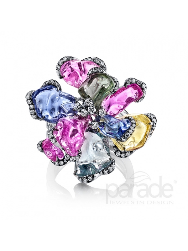 Luminous tumbled sapphires form a sculptural bloom, finished with black rhodium and sparkling white diamonds.