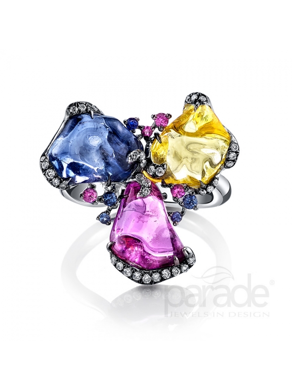 Tumbled pink, blue and yellow sapphires form a breathtaking bloom, elegantly finished with black rhodium, diamonds, and sapphires.