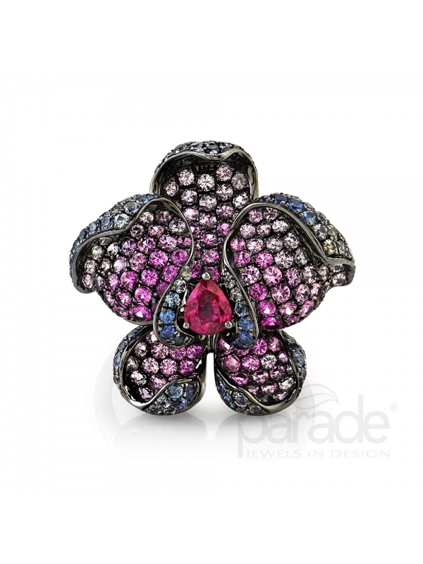 Extraordinary orchid ring bejeweled with 2.85 carats of carefully matched pink & blue sapphires, complemented with a vivid™®0.47 ct pear™®ruby center, dramatically set in 18K black gold.