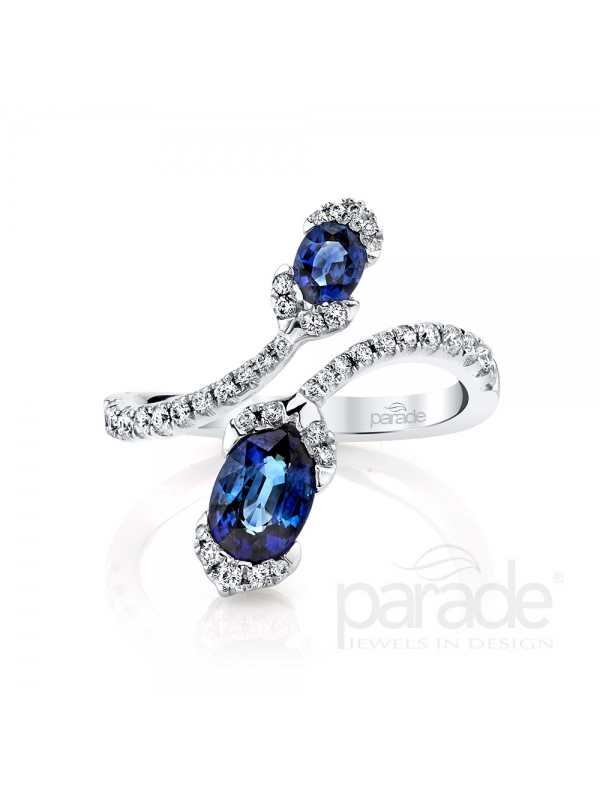 Open wrap, double blossom ring with white diamonds and 1.22 carats of lush blue sapphires in 18K gold.