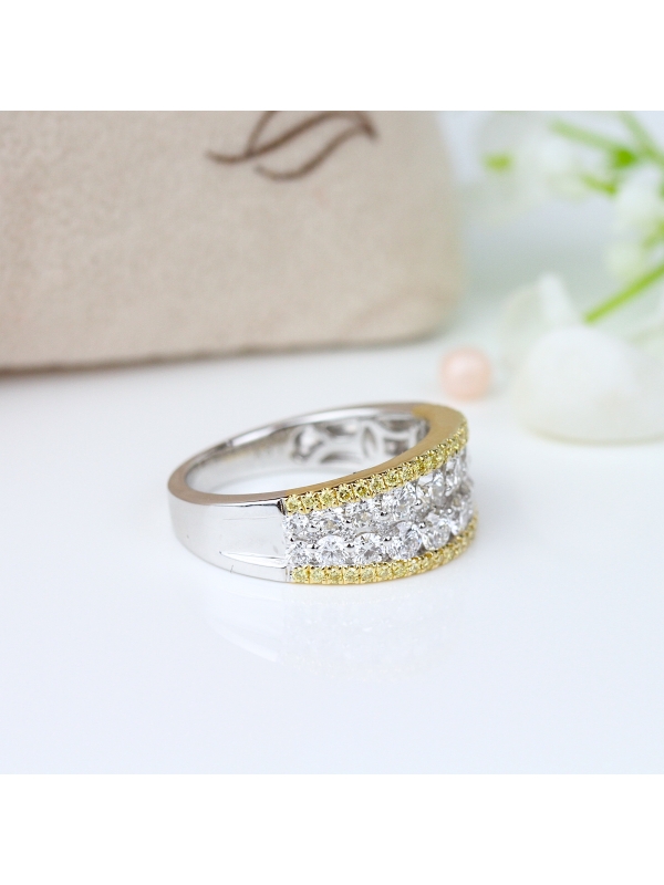 Sparkling two tone fashion band with luxurious fancy yellow diamonds set in 18K yellow gold surrounding 1.58 cts of brilliant white diamonds in 18K white gold.