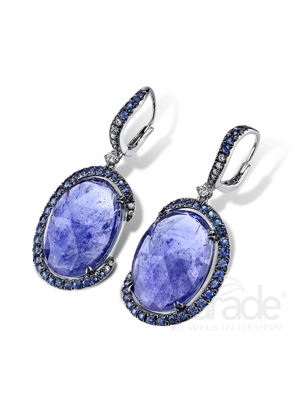 Indigo tanzanite slices dangle within 18K black gold set with bright blue sapphires and white diamonds.