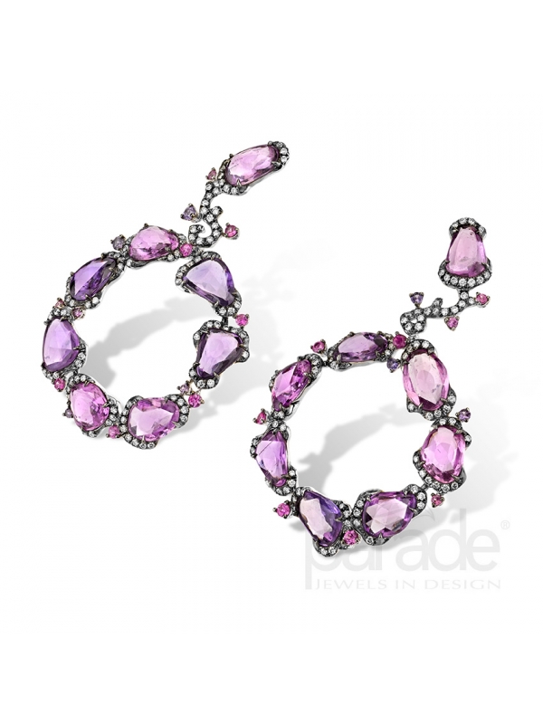 Beautiful pink sapphires in assorted shapes (18.61 carats total) form suspended hoops, gilded in solid 18k white gold and finished with black rhodium and glittering diamonds (0.84 carats).