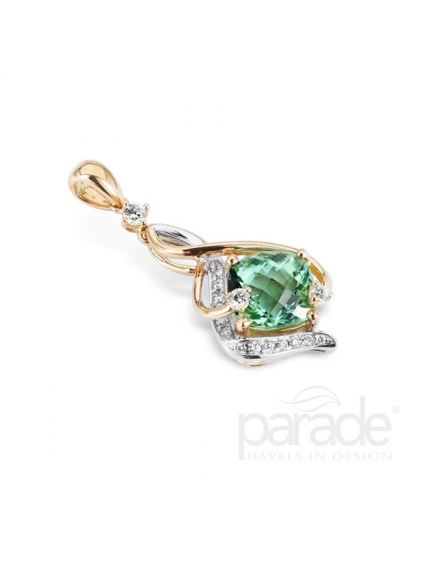 A mint green cushion-cut tourmaline nestles within swirls of diamonds and two-toned 18K gold.