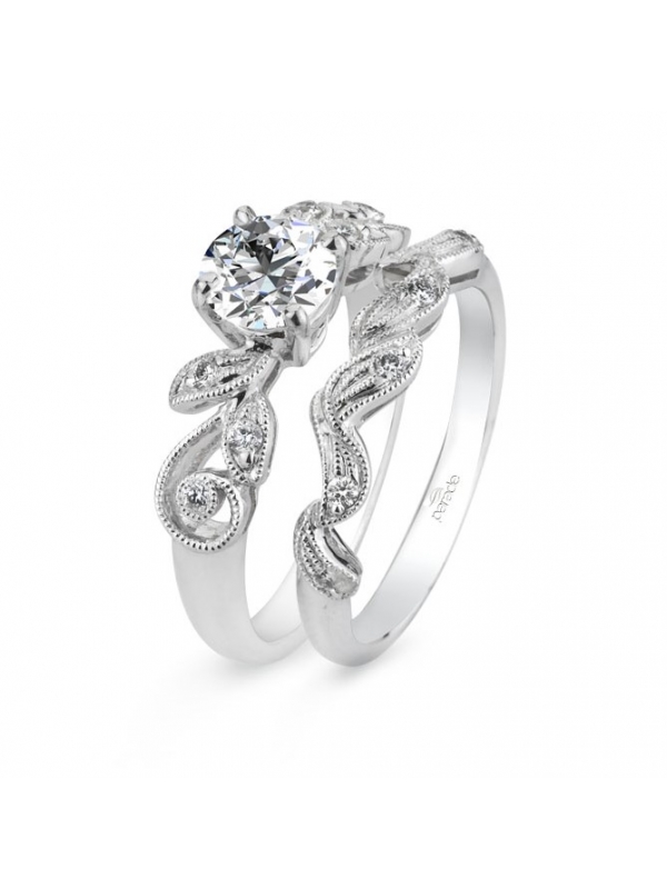 Meandering milgrain etched, diamond set leaves play along a Lyria Bridal engagement ring.