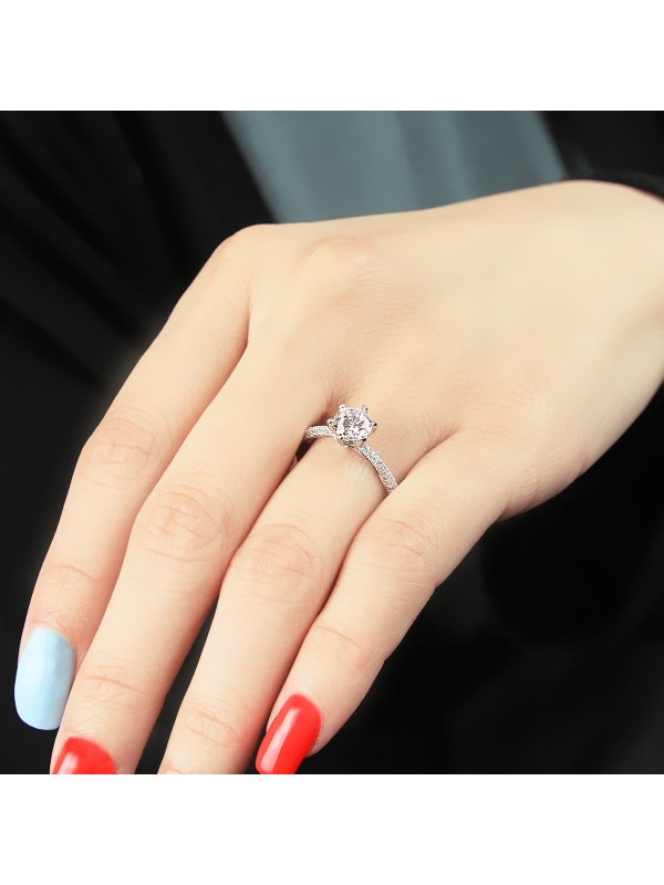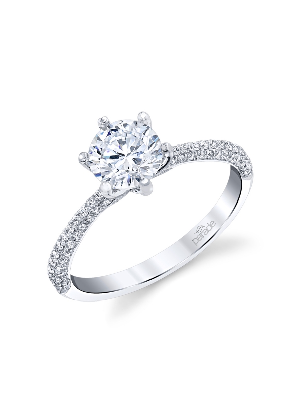 A gleaming band of diamonds accompanies a brilliant center stone set in a six prong crown in this timeless New Classic.
