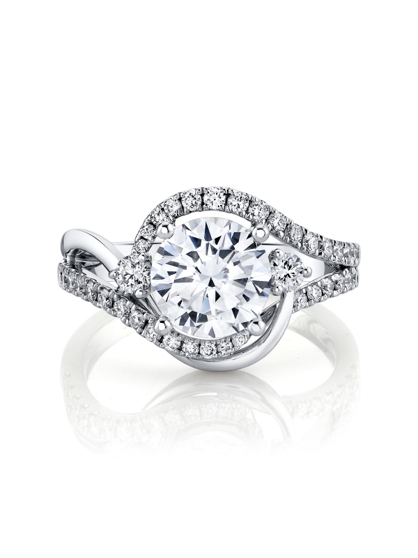Sweeping curves of diamonds and sleek high polished 18k gold spotlight a brilliant center stone.