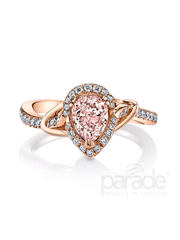 A pear shaped fancy pink diamond is enveloped in a delicate sweeping diamond halo, completed with curving diamond accents in 18K gold.