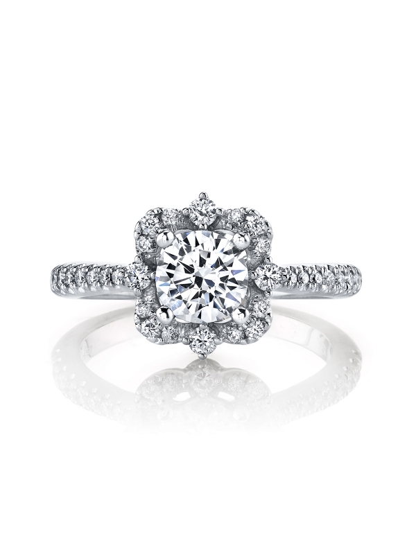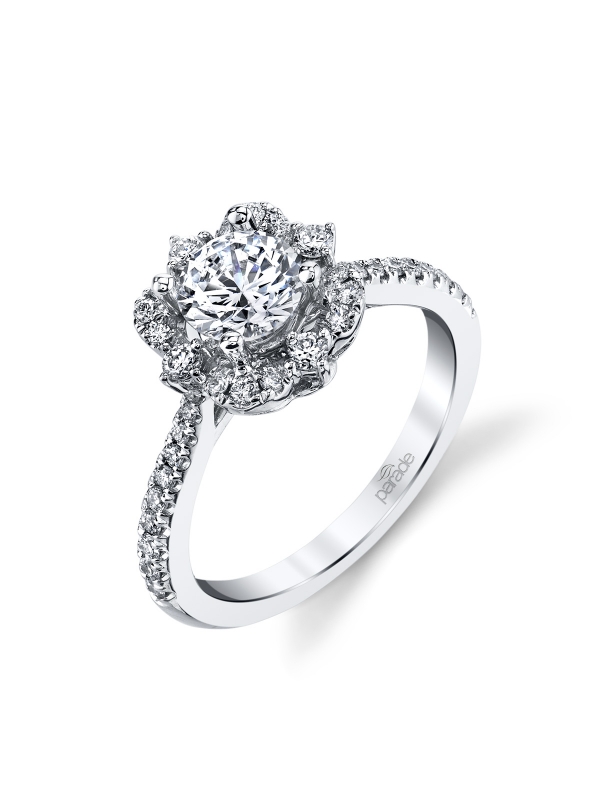 A brilliant center diamond sparkles within an artistic diamond halo, sitting atop a gleaming tapered diamond band.