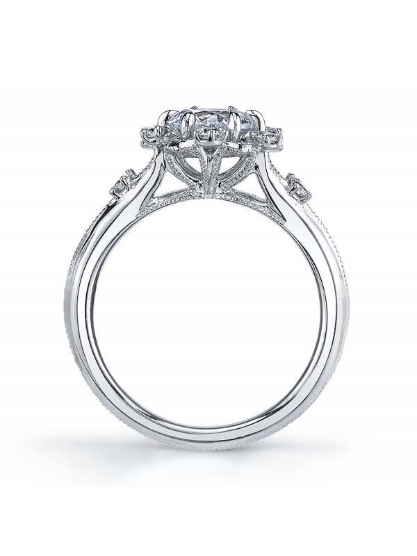Scattered brilliant diamonds set in an open halo, and finished with intricate milgrain detailing create this stunning vintage inspired design from the Hera Bridal collection.