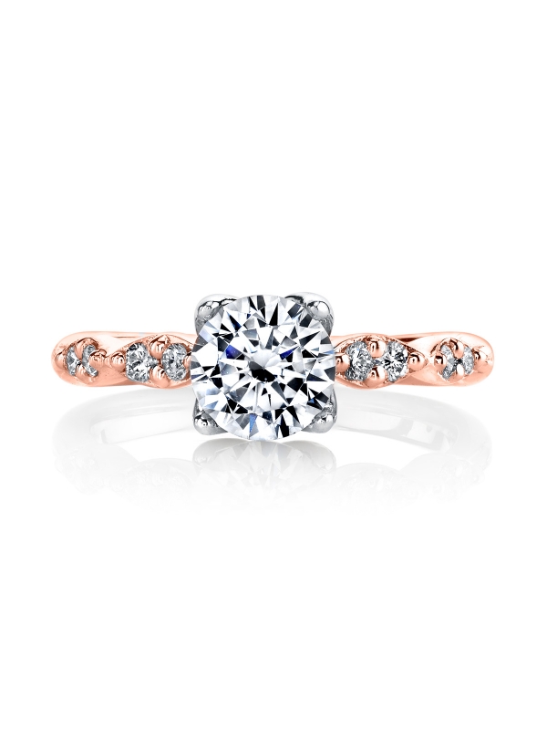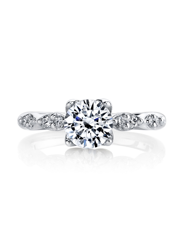 Clean and modern, a geometric band of brilliant white diamonds set in gleaming 18k gold highlight a round center stone set in the Lyria Signature Crown to perfection.