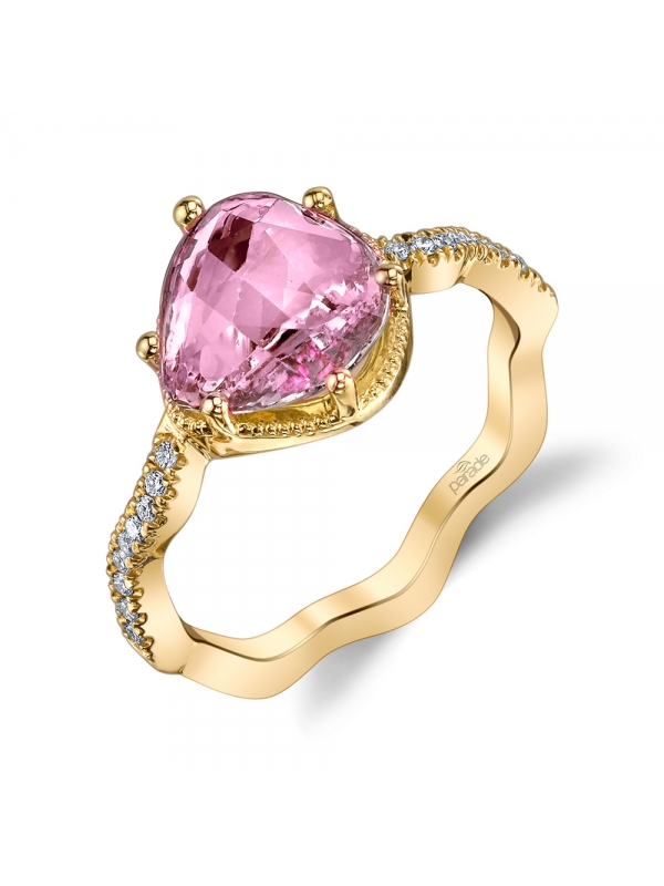 The natural shape of a fancy tumbled-cut pink sapphire is highlighted by intricate milgrain detailing, floating above a wave of sparkling white diamonds set in 18K yellow gold.