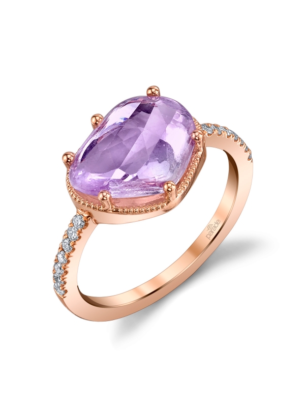 The natural shape of a fancy rose-cut pink sapphire is highlighted by intricate milgrain detailing, floating above a band of sparkling white diamonds set in glowing 18K rose gold.