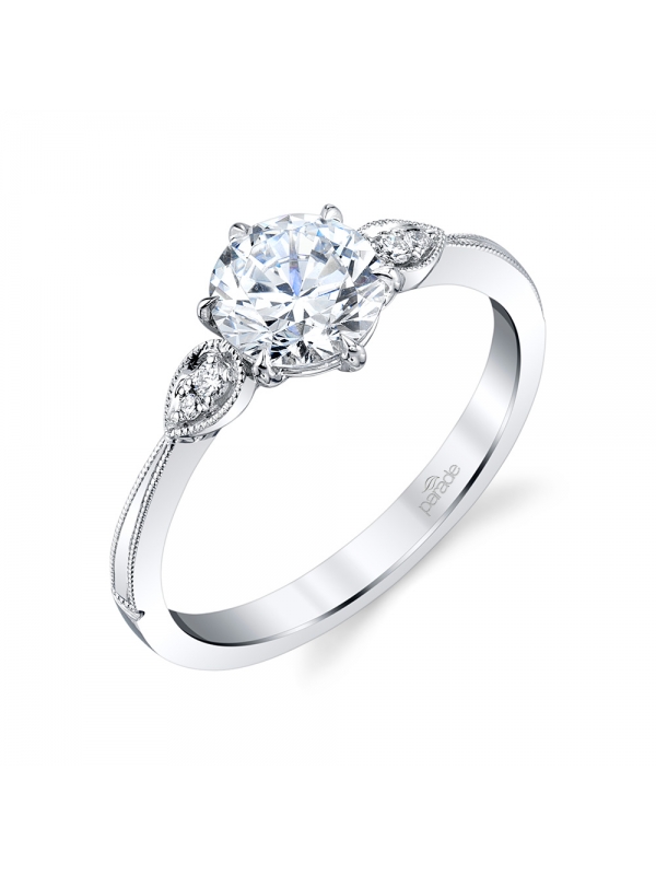An elegant milgrain etched band of gleaming high polished gold tapers towards a brilliant center stone set in a 6 prong crown accented by diamond set pears, in this design from the New Classic Bridal Collection.