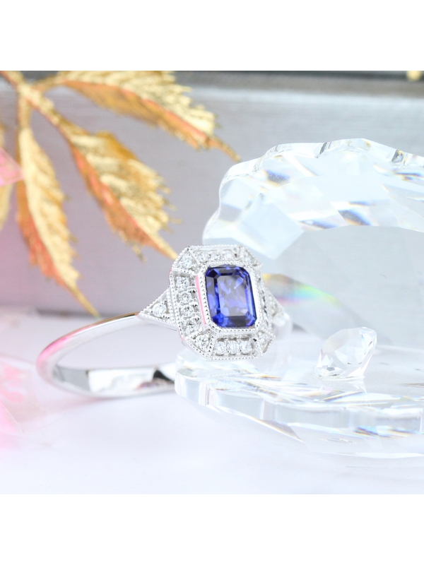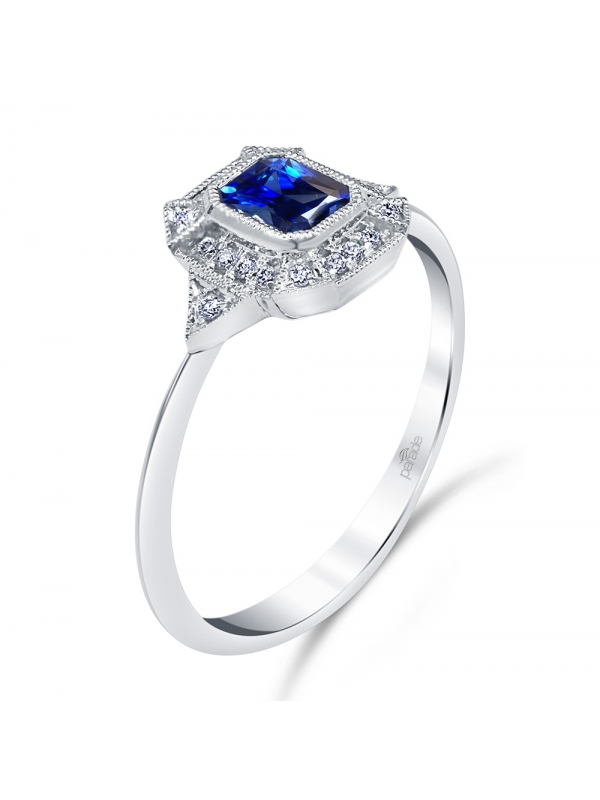 Nestled in a beautiful halo of diamonds, rests a deep blue emerald-cut sapphire, resulting in an elegant ring from the Parade in Color Collection.
