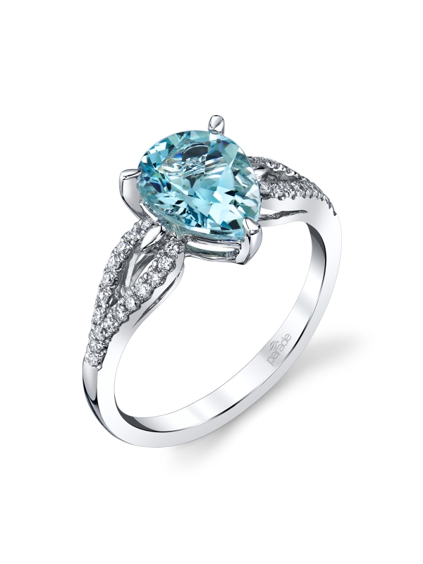 From the Parade in Color collection, a bright pear shaped blue zircon shines above a split diamond band in 18k white gold.