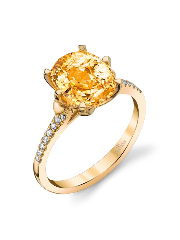 An oval shaped peach sapphire glows brightly atop a tapered diamond band in 18k yellow gold in this sleek style from the Parade in Color Collection.