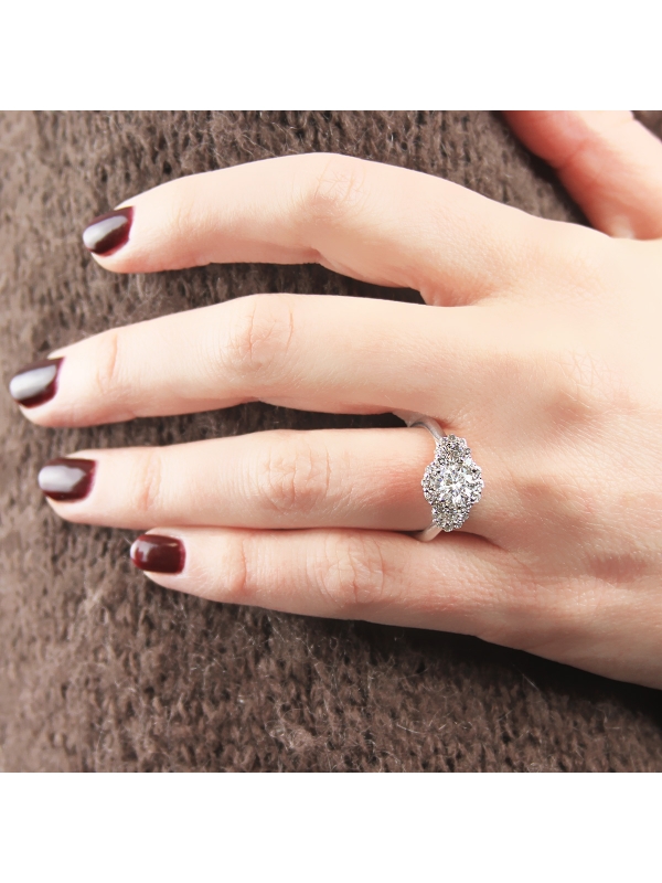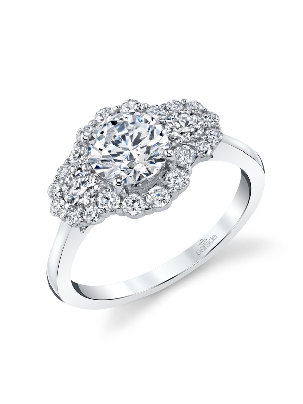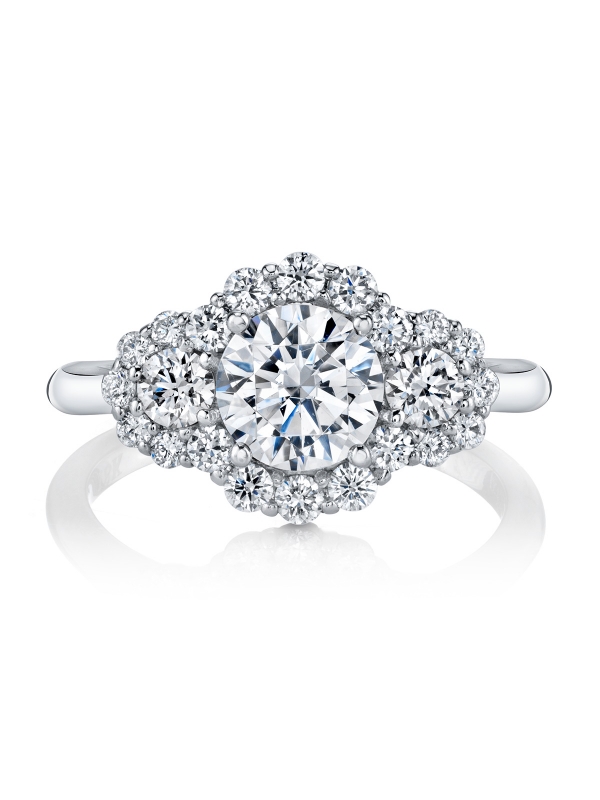 A refreshing new take on the classic three-stone ring featuring three brilliant cut diamonds each wrapped in a continuous halo.