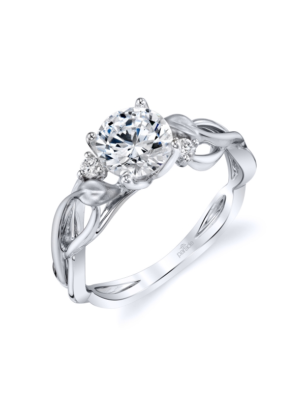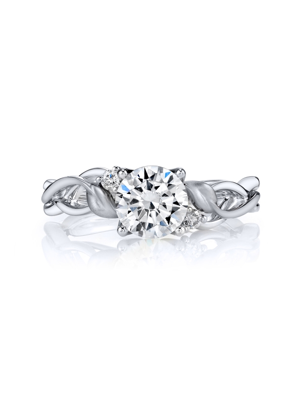 A brilliant center stone sits atop diamond accents along intertwined branches of high polished 18K gold and warm Lyria Leaves in this organic design from the Lyria Bridal collection.