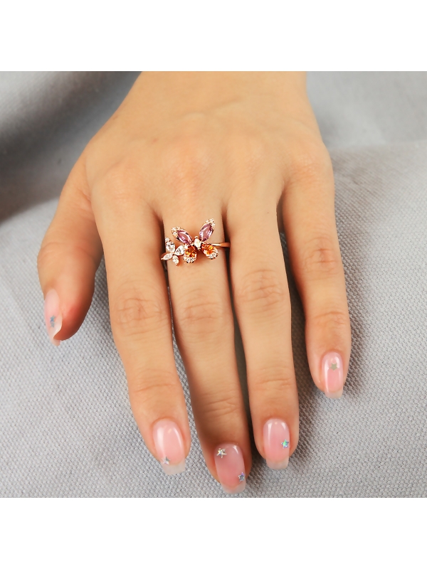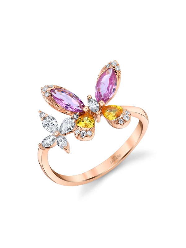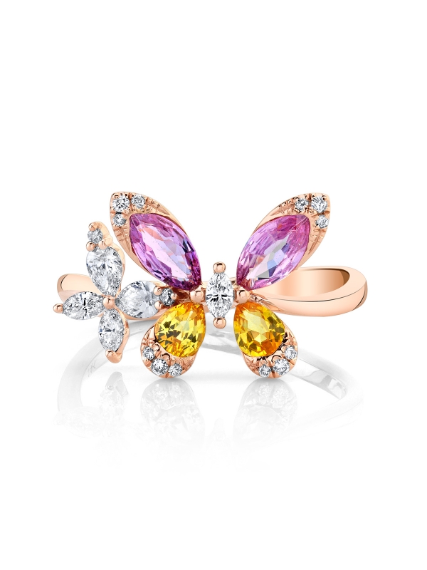 Two sparkling butterflies sit on top of this elegant ring. The yellow and pink sapphires harmonize with the glittering diamonds, radiating an exuberant aura.