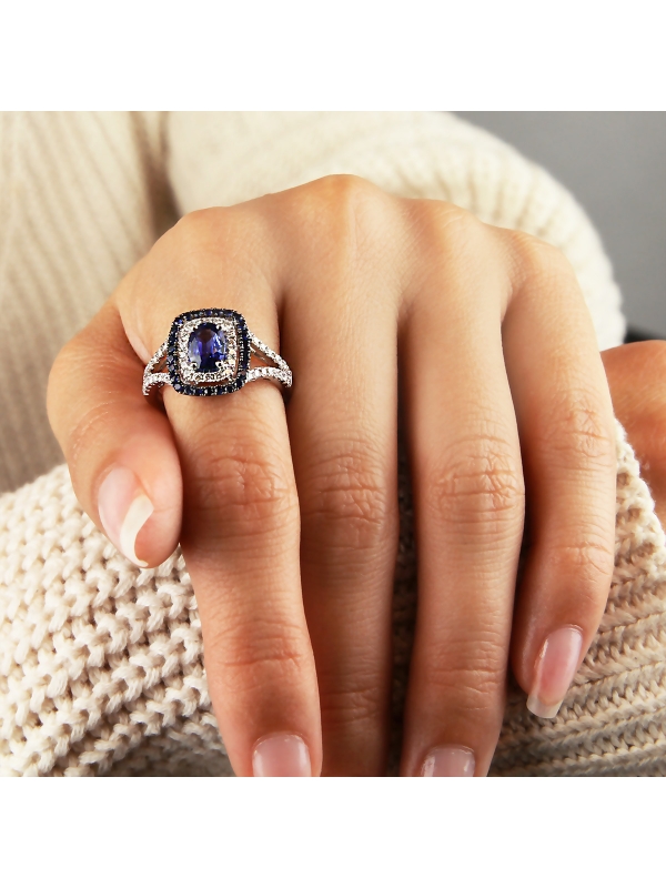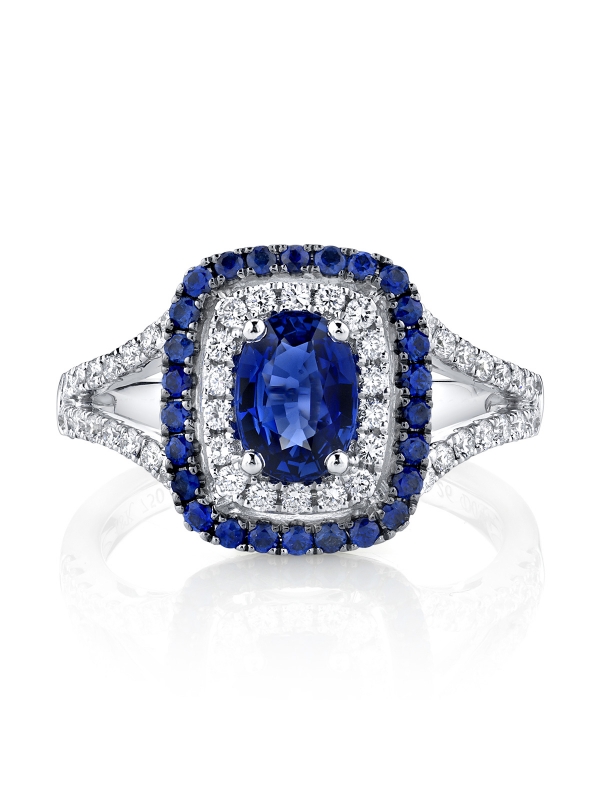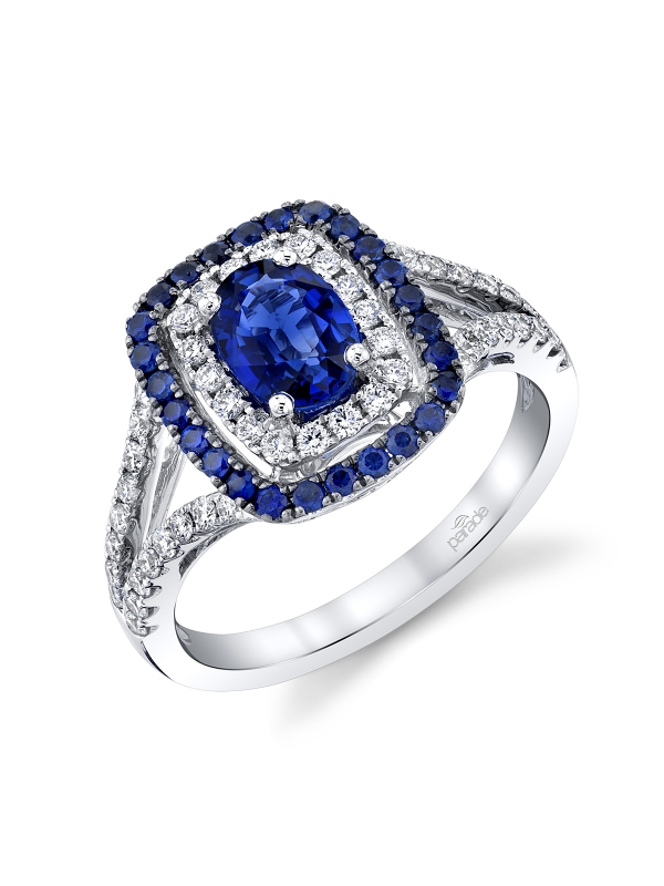 Nestled in a beautiful double halo of diamonds and sapphires, rests a deep blue oval cut sapphire. The sophisticated halo unites with a sparkling diamond band, resulting in an elegant ring from the Parade in Color Collection.