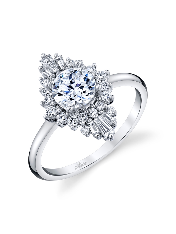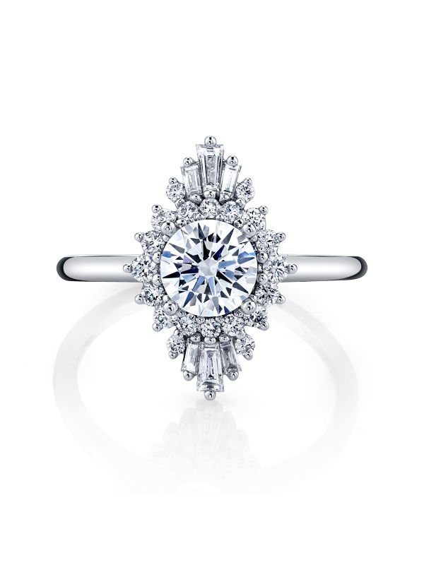 From the Hera Bridal Collection, features a vintage inspired engagement ring with a stunning halo of sparkling round and baguette diamonds.