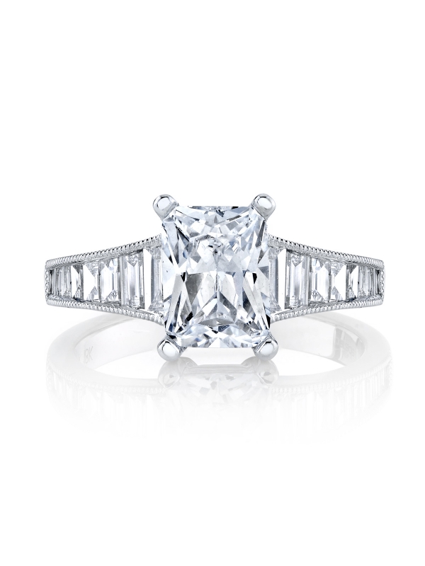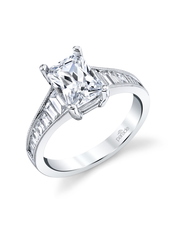 This classic design features a stream of ascending baguette diamonds that leads to an octagonal beauty.