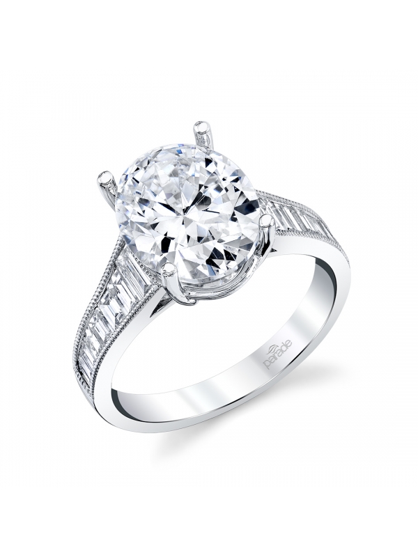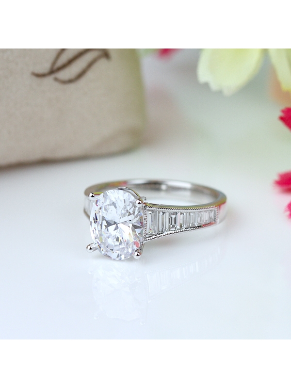 The vertical alignment of immaculately bright baguette diamonds complements the oval shaped center diamond and highlight this contemporary classic.