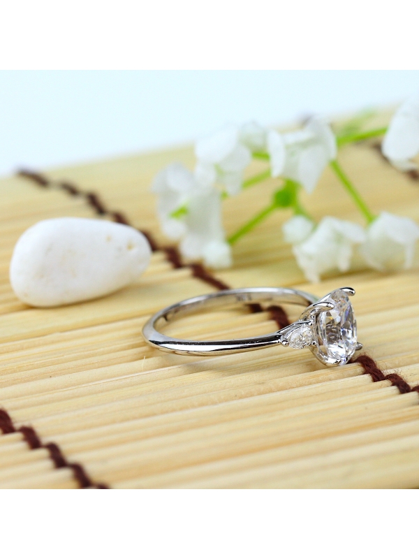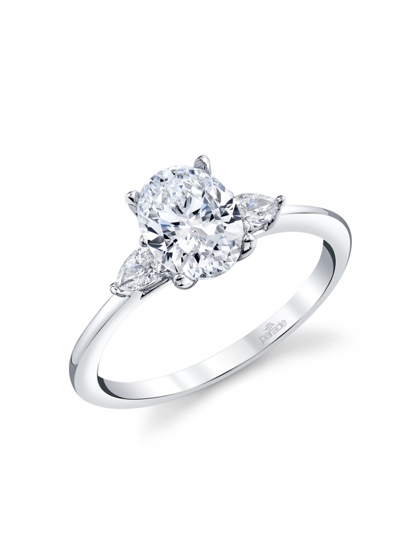 The classic 3 stone ring is refined in this design with a slender body and delicate pearshape diamonds that highlight the grace of the oval diamond.